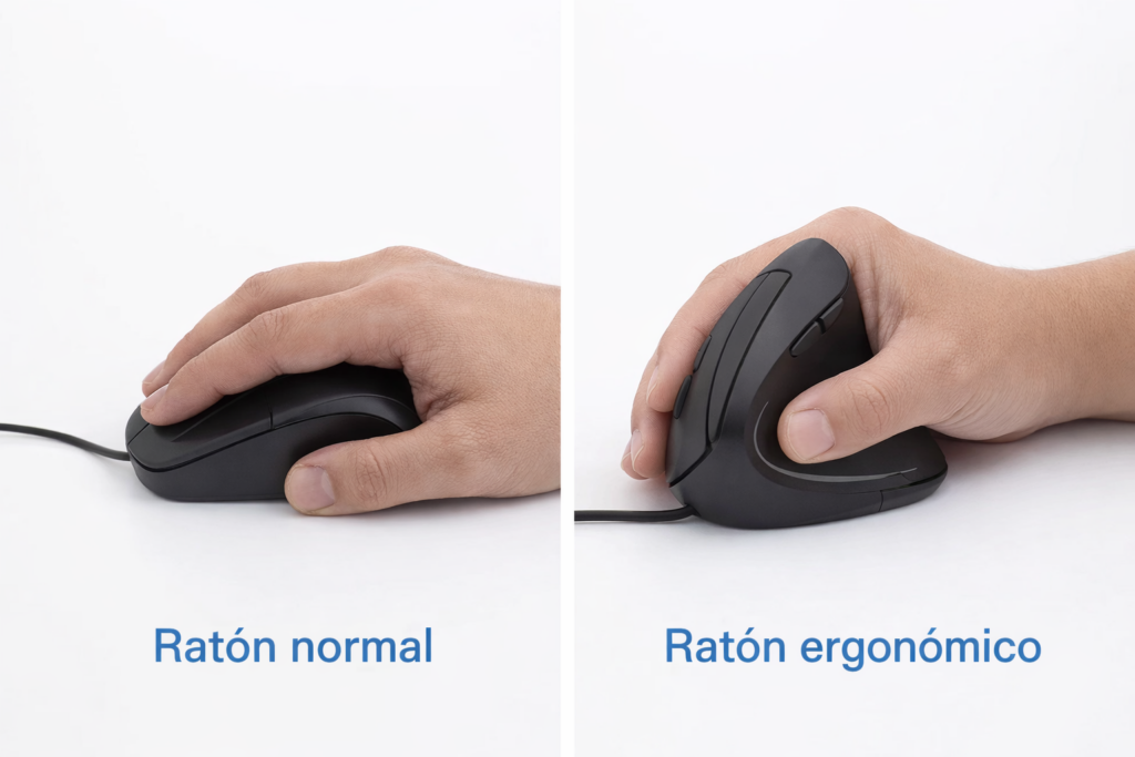 - La diferencia principal está en la posición de la muñeca: el ratón normal obliga a girarla, mientras que el ergonómico la mantiene en una postura más natural.
